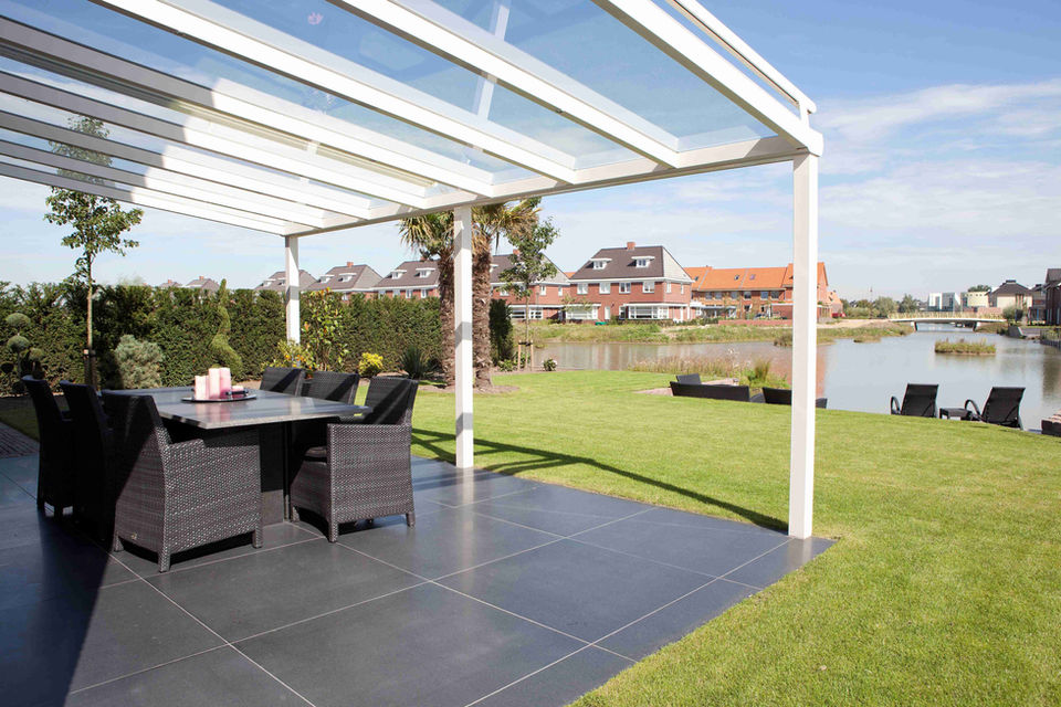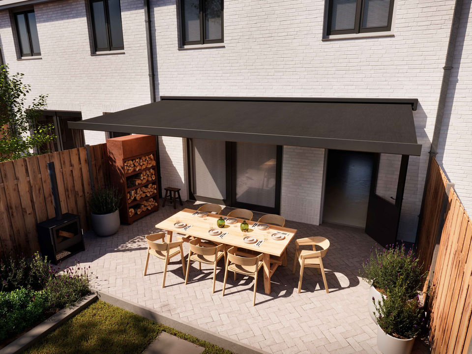 Stylish shade for large terraces. Create a cozy and quiet outdoor space with our motorized pergola awning — perfect for large terraces.